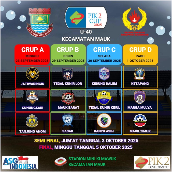 Tangerang, — Semangat olahraga kembali menggema di Kecamatan Mauk, Kabupaten Tangerang dengan digelarnya kompetisi sepak bola U-40 bertajuk “PIK 2 CUP 2025”. Turnamen yang berlangsung di Stadion Mini Ki Mauk ini resmi dibuka pada Minggu (28/9/2025) oleh Camat Mauk, Angga Yulyantono, S.IP., M.Si.